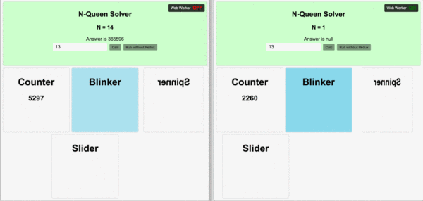 如果将 N-皇后计算放置到 worker 线程,我们会发现 demo 展现了令人惊讶的性能提升,完全丝滑毫无卡顿。如上图,左半部分为正常版本,不出意外出现了页面卡顿,右侧是接入 worker 之后的应用。