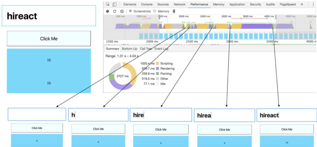 可以看到:在黄色 JavaScript 执行过程中,也就是 React 占用浏览器主线程期间,浏览器在也在重新计算 DOM Tree,并且进行重绘。只管来看,黄色和紫色等互相交替,同时页面截图显示,用户输入得以及时响应。简单说,在 React 占用浏览器主线程期间,浏览器也在与用户交互。这显然是“更好的性能”表现。