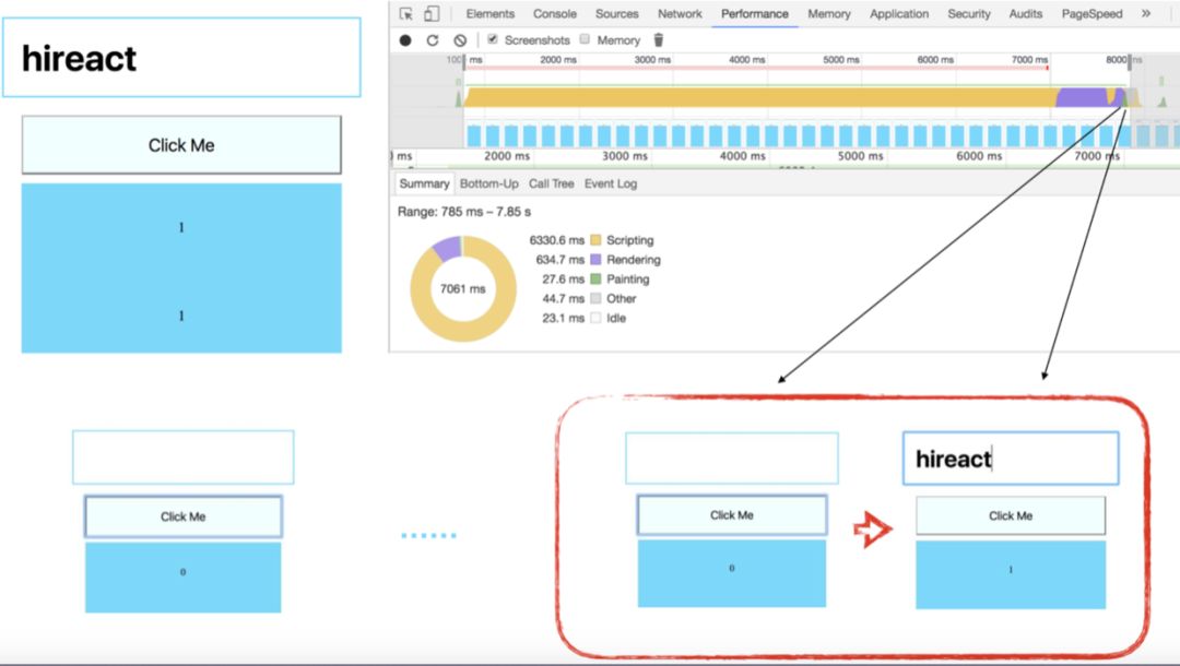 在这个例子中,我们可以设置 NUMBER_OF_BLOCK 的值为 100000。这时候点击按钮,触发 setState,页面开始更新。此时点击输入框,输入一些字符串,比如 “hi,react”。可以看到:页面没有任何响应。等待 7s 之后,输入框中突然出现了之前输入的 “hireact”。同时, BlockList 组件也更新了。